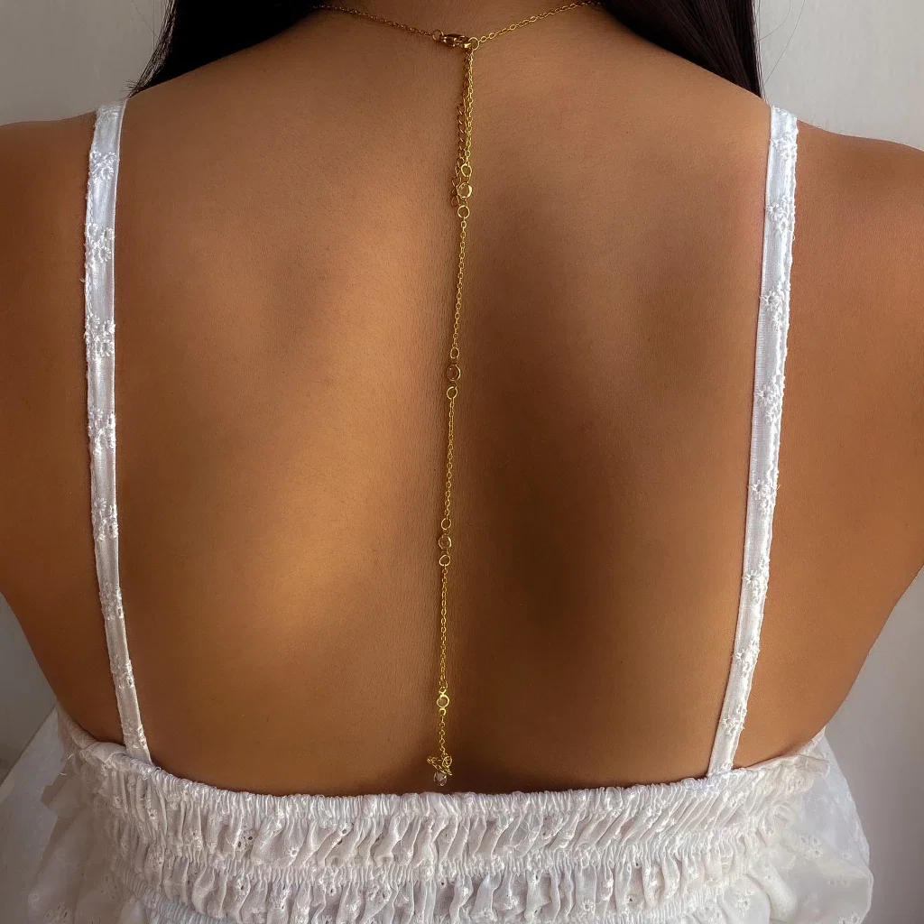 Collar con extensor para lucir sobre la espalda, perfecto para realzar looks nocturnos o destacar prendas con espalda descubierta. Medidas aprox: - Largo regulable: 45 a 50cm. - Colgante de espalda: 25cm. Material: Acero dorado.
