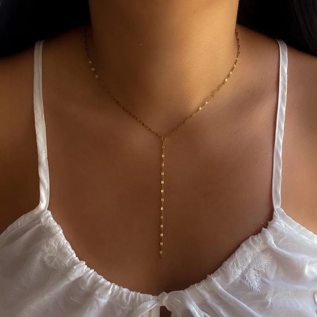 Collar cadena eslabones planos, más extensión, estilo corbatero. Medidas aprox: - Largo regulable: 45 a 50cm + 10cm de extensión. Material: Acero dorado.